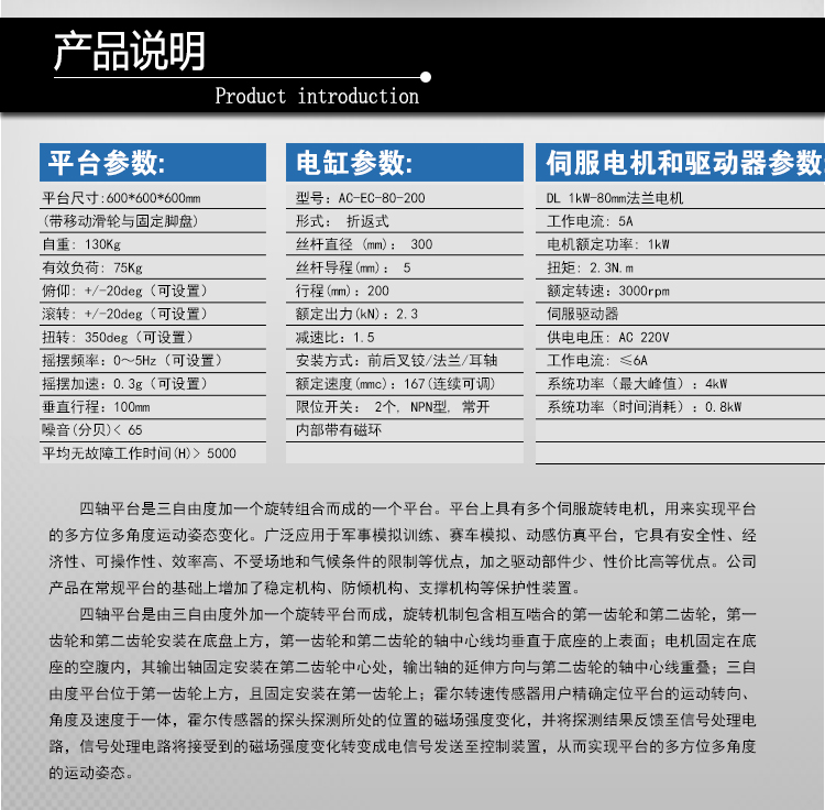 四軸平臺是三自由度加一個旋轉組合而成的一個平臺。平臺上具有多個伺服旋轉電機,用來實現平臺的多方位多角度運動姿態變化。廣泛應用于軍事模擬訓練、賽車模擬、動感仿真平臺,它具有安全性、經濟性、可操作性、效率高、不受場地和氣候條件的限制等優點,加之驅動部件少、性價比高等優點。公司產品在常規平臺的基礎上增加了穩定機構、防傾機構、支撐機構等保護性裝置。